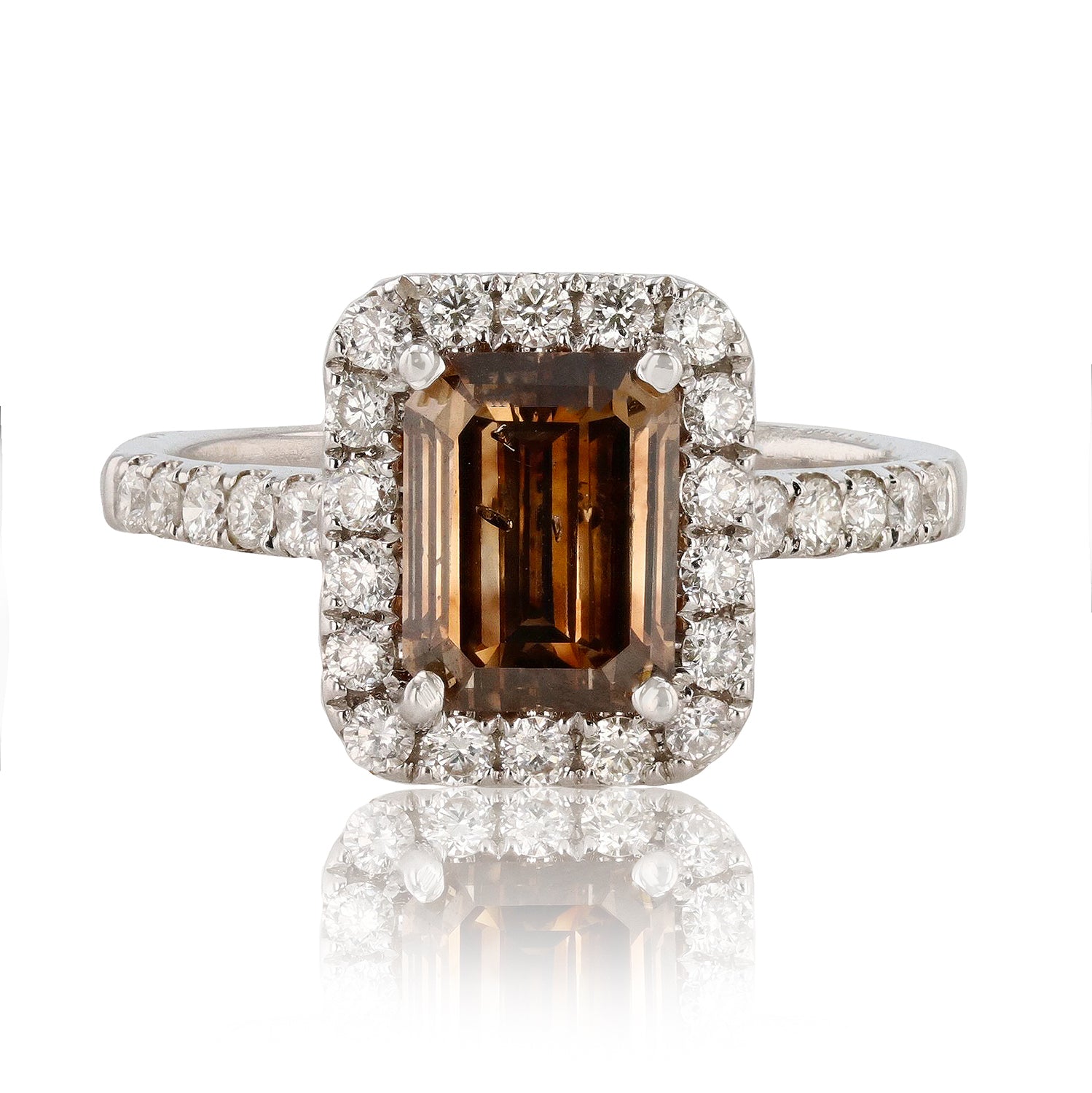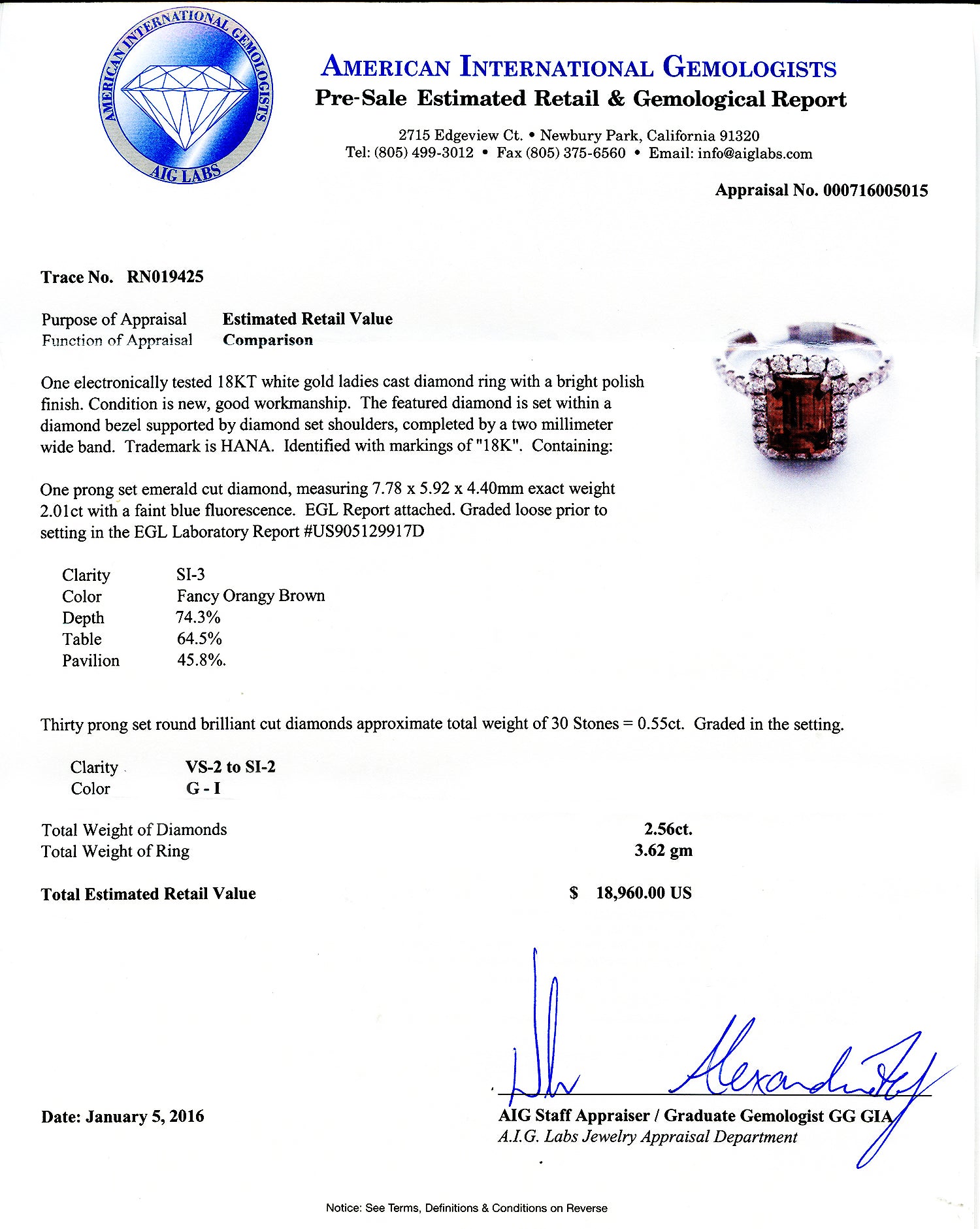 The feature diamond is set with an a diamond bezel supported by diamonds that shoulders completed by 2 mm wide band. One prong set emerald cut diamond measuring 7.78 x 5.92 x 4.40 mm exact weight 2.01 carats with a faint blue florescence.