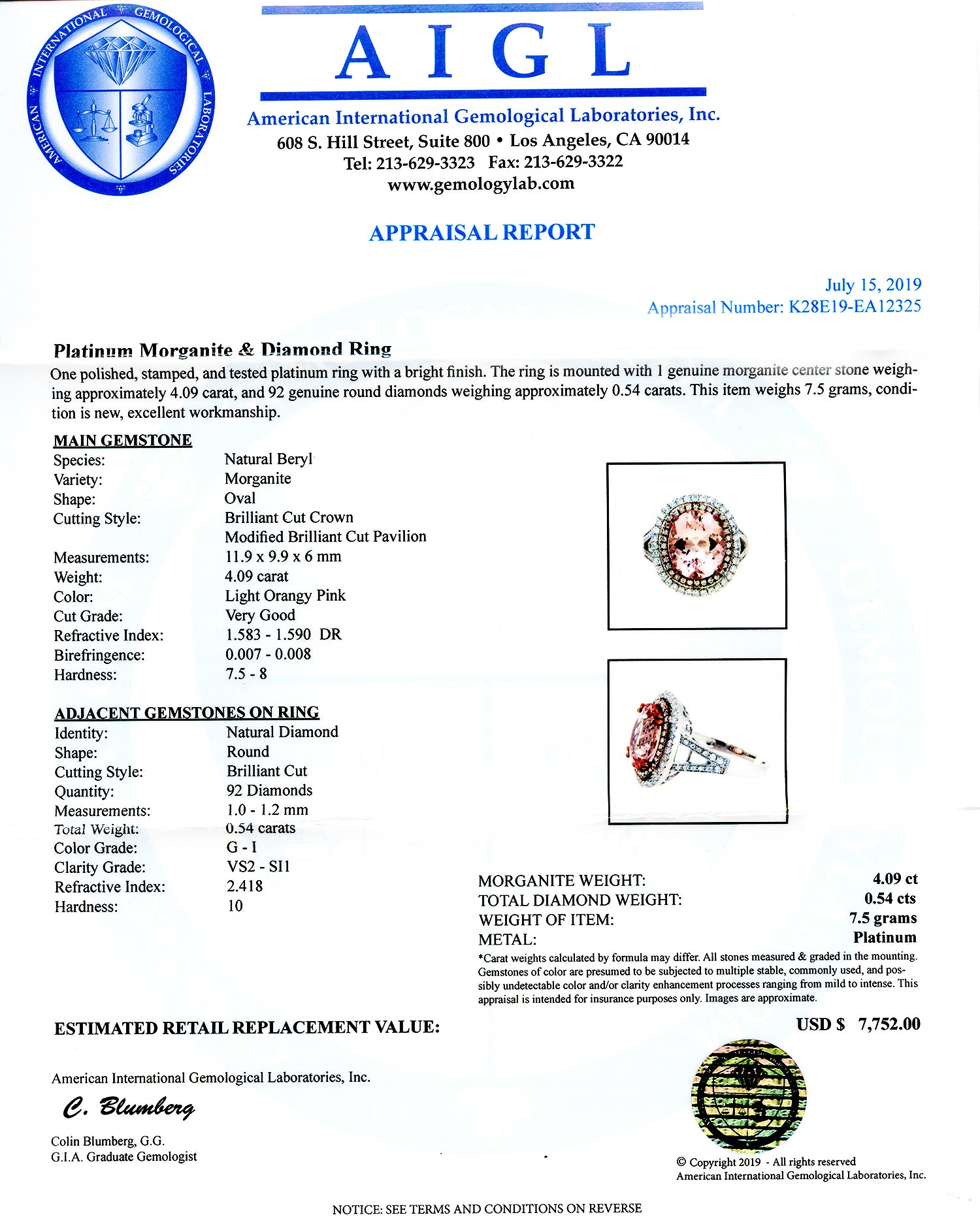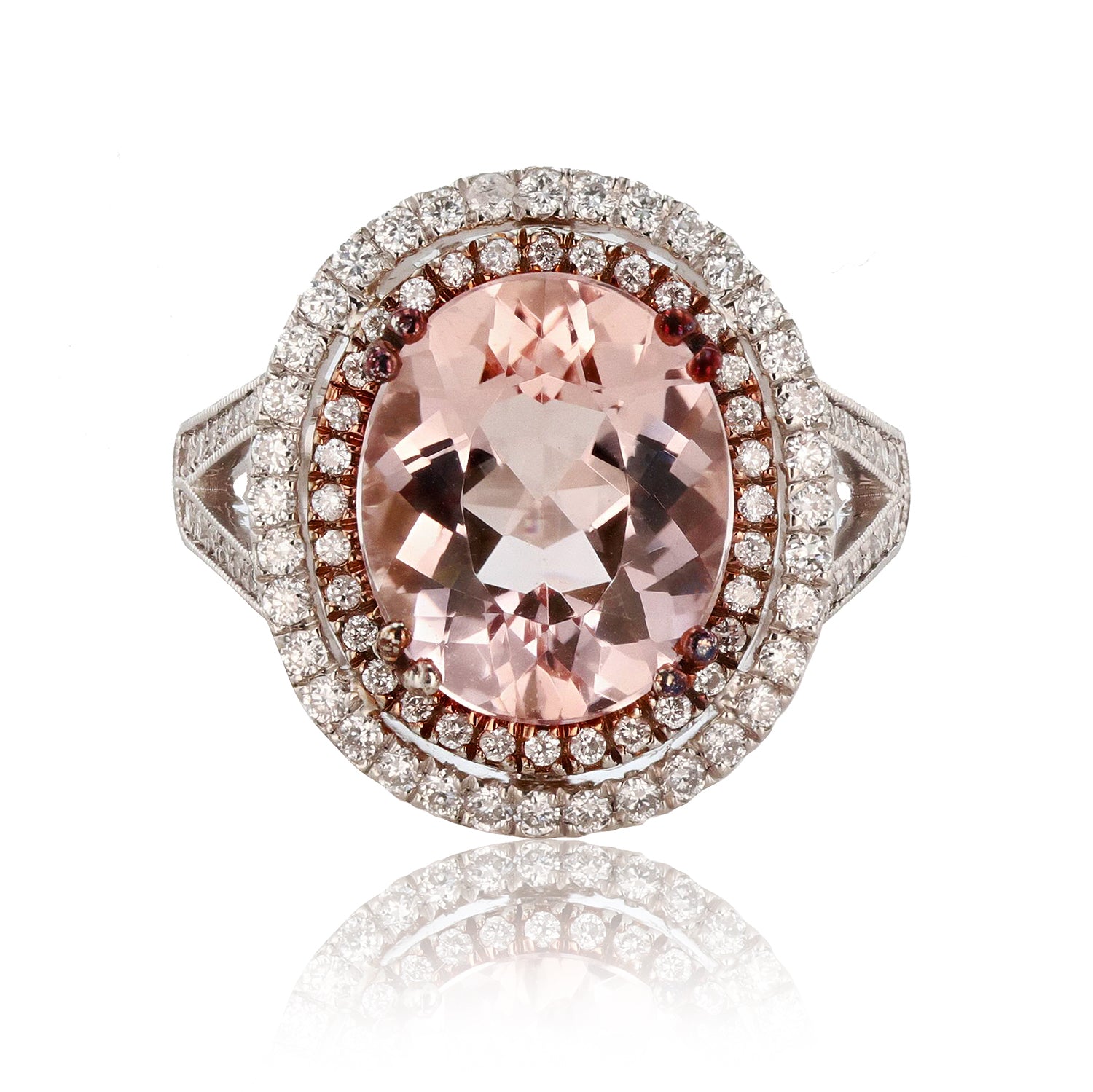 This ring is mounted with one genuine morganite Centerstone weighing approximately 4.09 carrots, and 92 genuine round diamonds weighing approximately 0.5 for carrots. This item weighs 7.5 g condition is new, excellent workmanship.