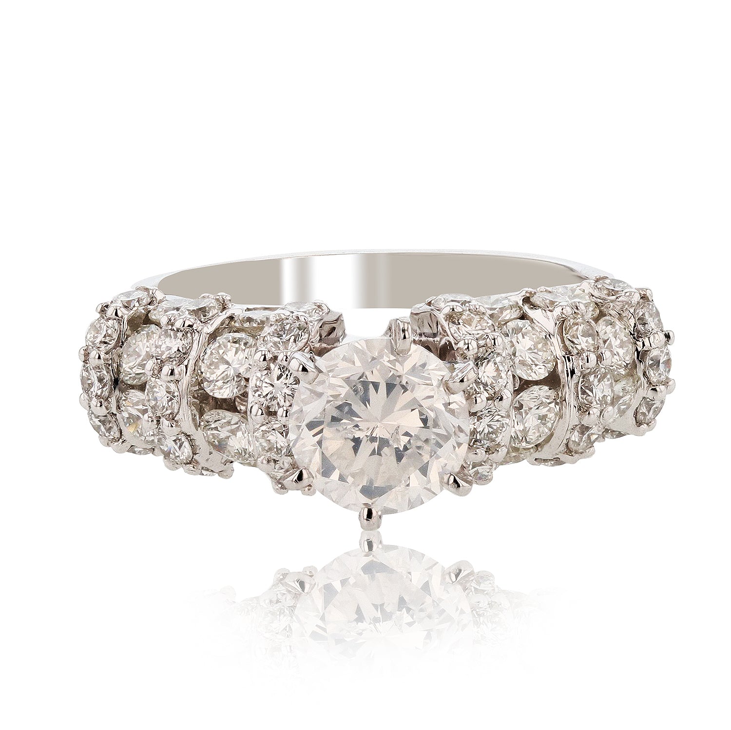 The featured diamond is set within a curvature of alternating ribbons of round diamonds, completed by a three millimeter wide band.  One prong set round brilliant cut diamond.