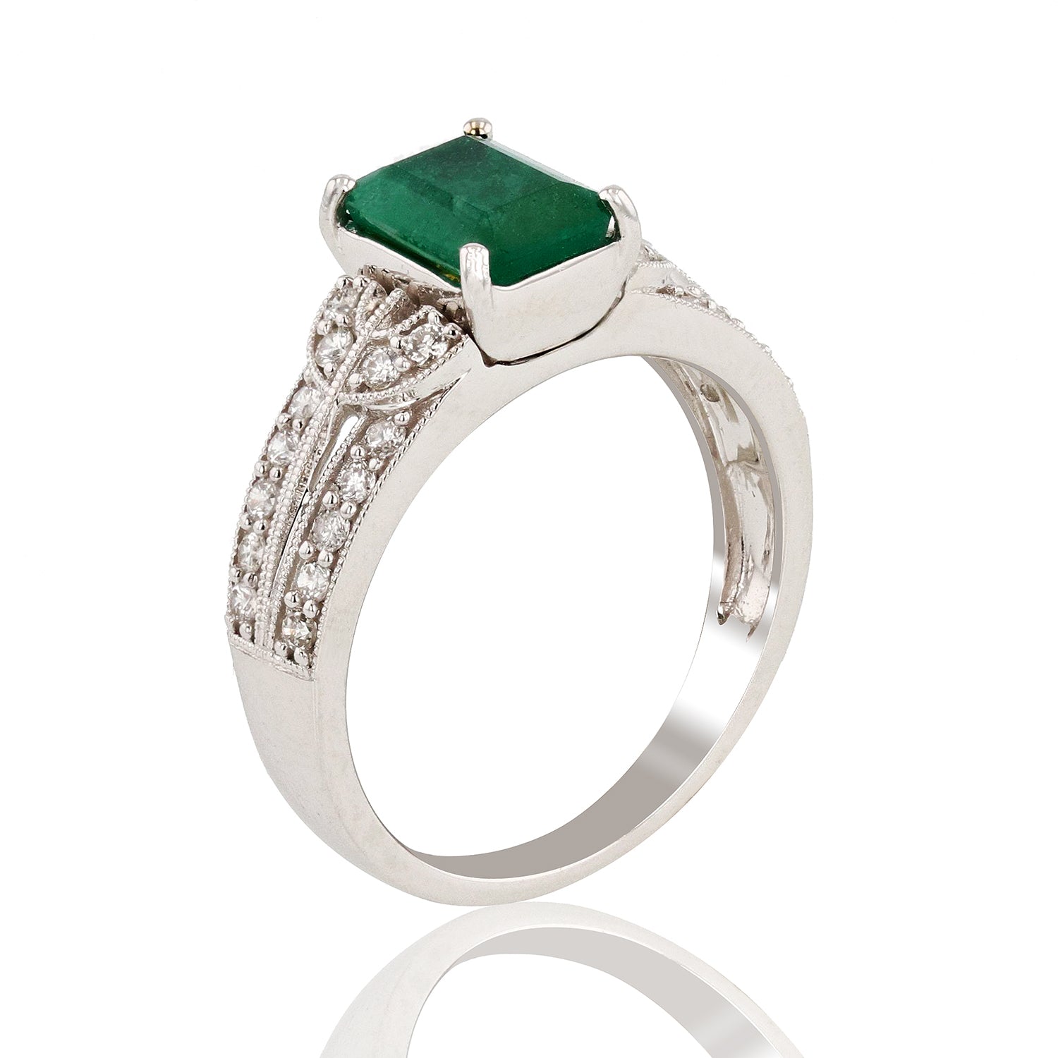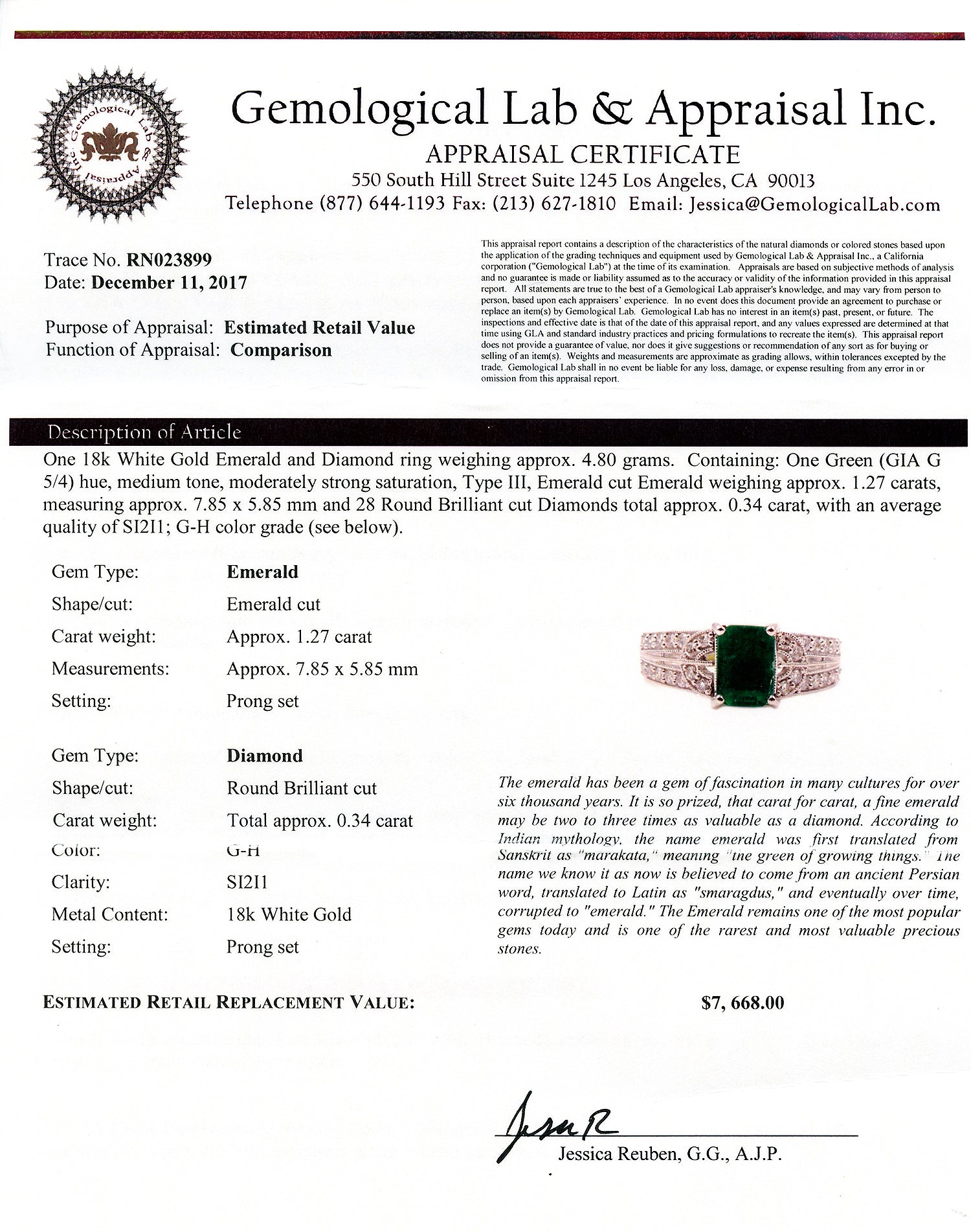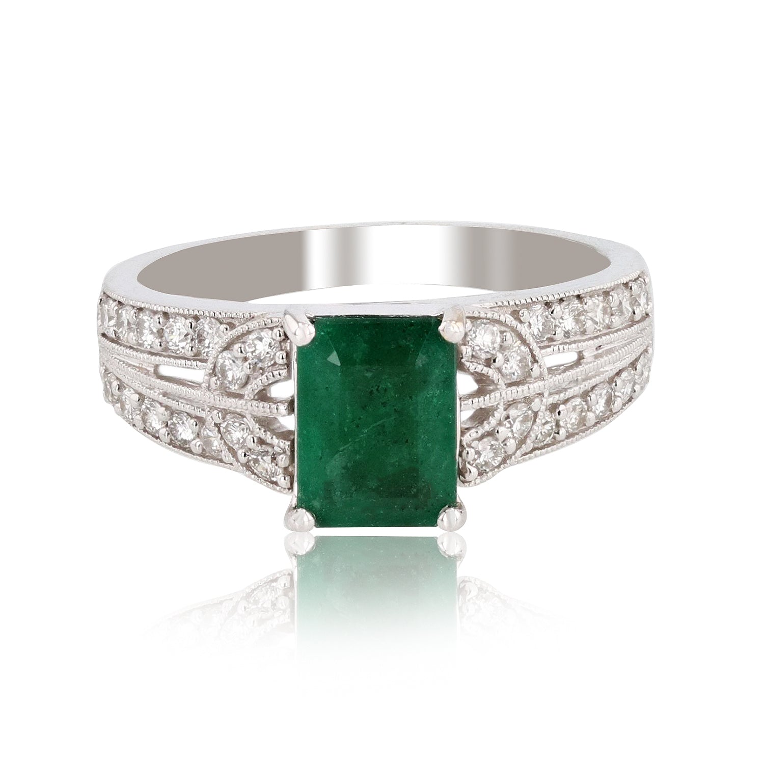 18K white gold emerald and diamond ring weighing approximately 4.80 grams, and 28 round brilliant cut diamonds approx. 0.34 carats.